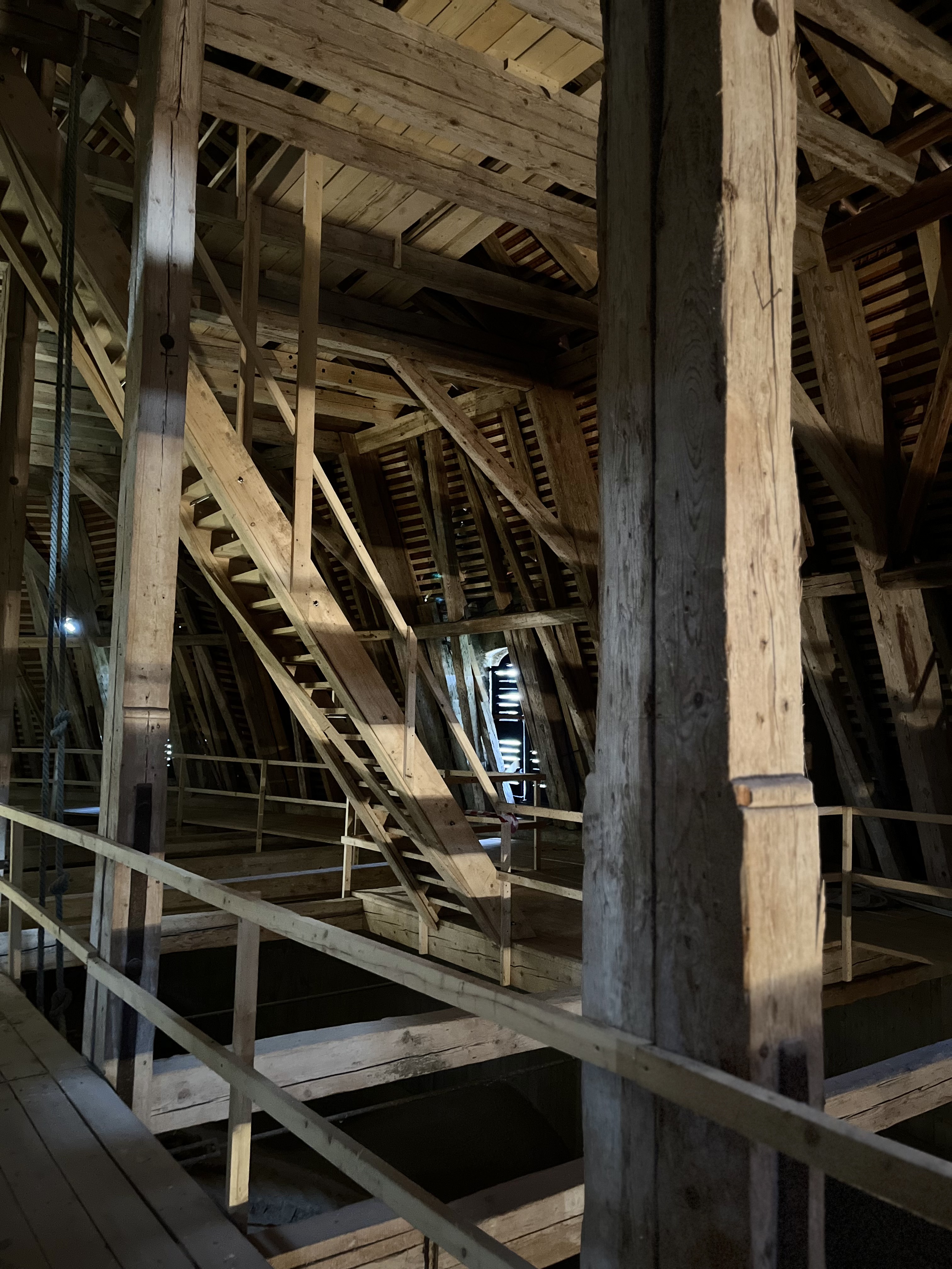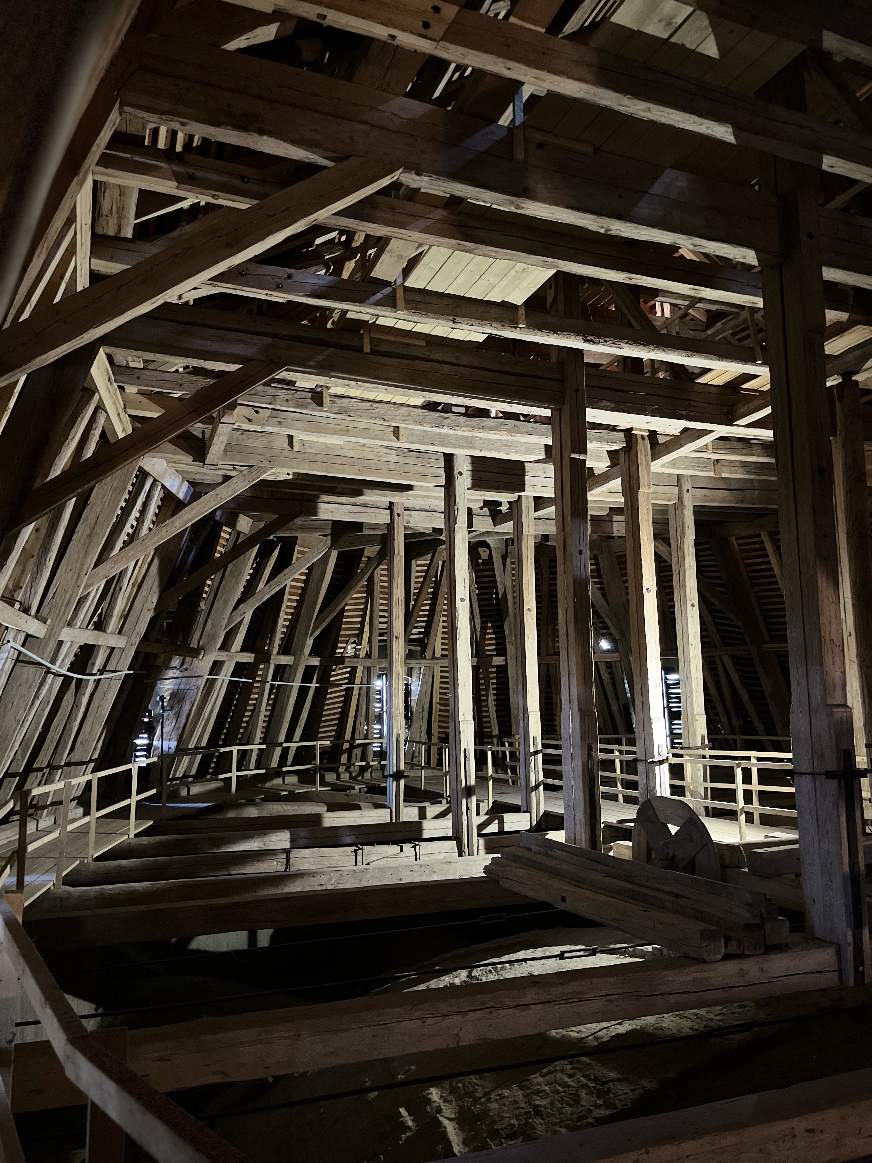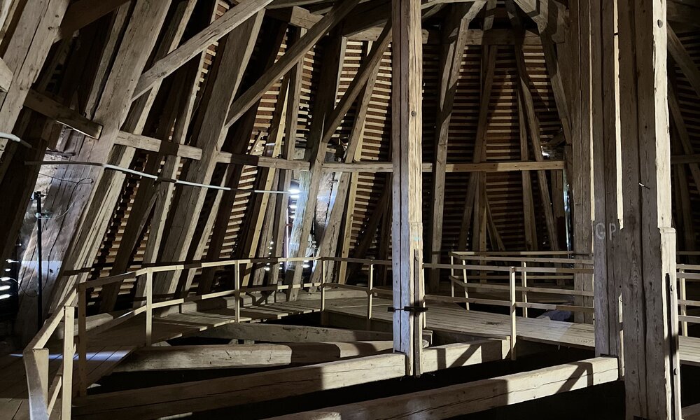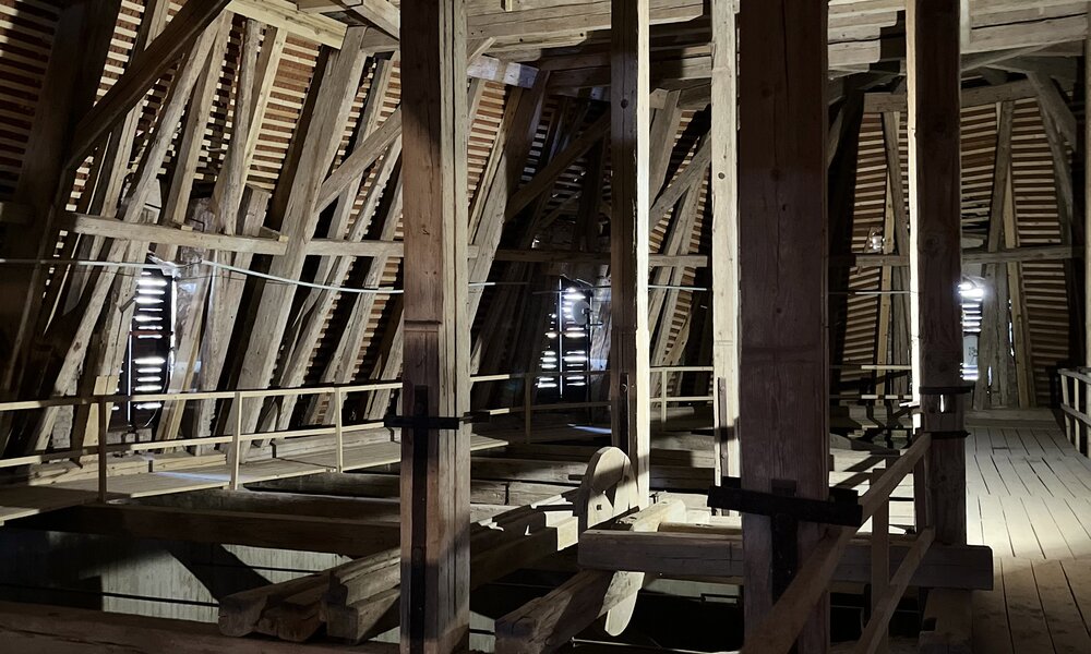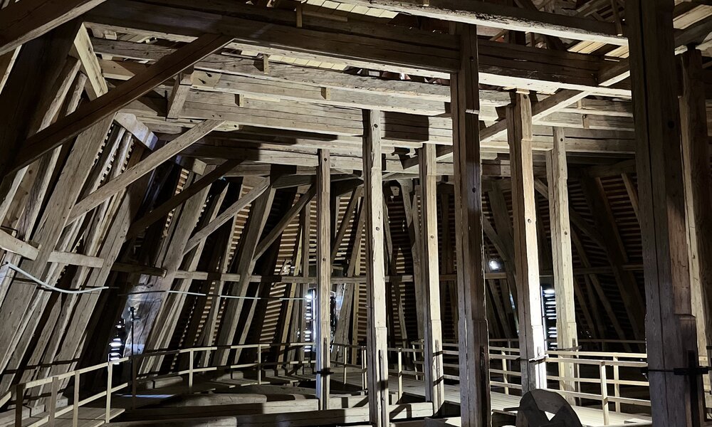 Nepřijdete ani o pohled ze severní terasy s výhledem na údolí řeky Dyje - místo, kde se historie potkává s krajinou. Seznámíte se s příběhem vody na hradě – včetně jedinečných vodních věží a rumpálu, kterým se čerpala voda přímo z řeky. Zlatou tečkou na závěr bude i střešní konstrukce a krov nad Sálem předků – prohlédnete si rozsáhlý, devět metrů vysoký dvoupatrový krov z roku 1740.